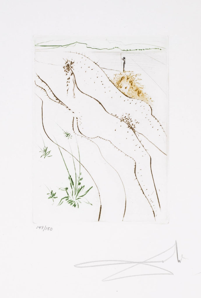 "Le Tonneau (Plate G)" is an etching and drypoint, created by Salvador Dalí as a part of his series 'Le Decameron' in 1972. From the edition of 725, the artwork is signed 'Dalí' lower right and annotated lower left. The image size is 6.75 x 5" and the artwork is framed in a ornate, gold-tone frame. The artwork ships framed and is accompanied by a certificate of authenticity.