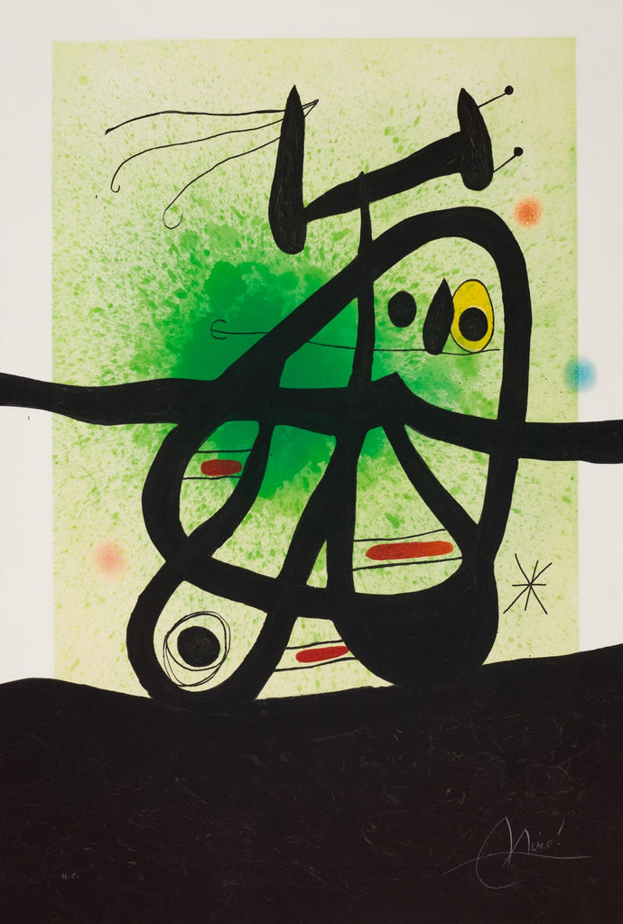 Joan Miró is regarded as one of the most original artists of the 20th century, who often worked with a limited palette, yet the colors he used were bold and expressive. His mature style evolved from the tension between his fanciful, poetic impulse and his vision of the harshness of modern life. Miró worked extensively in lithography and produced many murals, tapestries, and sculptures for public spaces. Despite his fame, he continued to devote himself exclusively to looking and creating. Joan Miró was born in Barcelona, Spain on April 20, 1893. His father was an artisan watchmaker and goldsmith. Based on his parents’ wishes, Miró attended a commercial college, then found work as a clerk in an office for a short period of time. Unfulfilled by his profession, Miró asked for his parent’s permission to allow him to attend art school in Barcelona in 1912. There, he gained great experience learning under Francisco Galí.