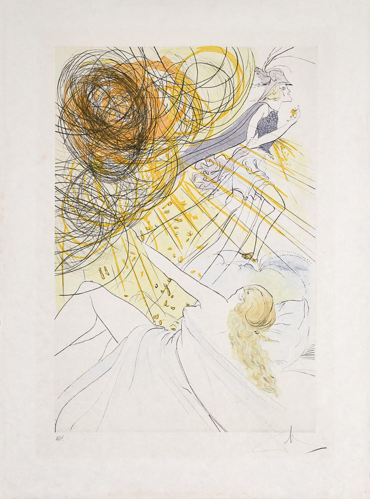 "Mercury" is an engraving with stencil color on Japon, created by Salvador Dalí as a part of his series "Hommage à Mercure" in 1973. From the edition of 300, the artwork is signed 'Dalí' lower right and annotated lower left. The image size is 23.25 x 15.75" and the artwork is framed in a ornate, gold tone frame. The artwork ships framed and is accompanied by a certificate of authenticity.