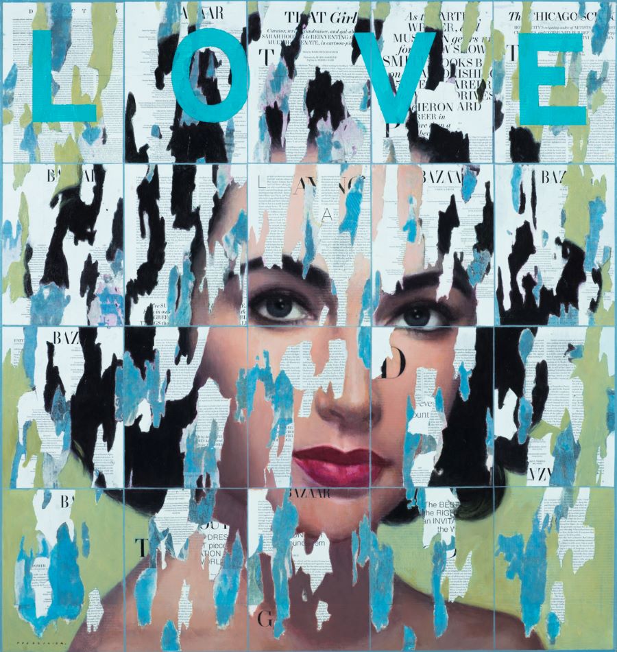 "Miss Taylor in Love" is an oil and mixed media on canvas painting by François Fressinier featuring American and British actress and Hollywood icon Liz Taylor. The artwork is signed 'FRESSINIER' lower left. The canvas size is 40.25 x 38" and the artwork is framed in a contemporary white frame. The artwork ships framed.