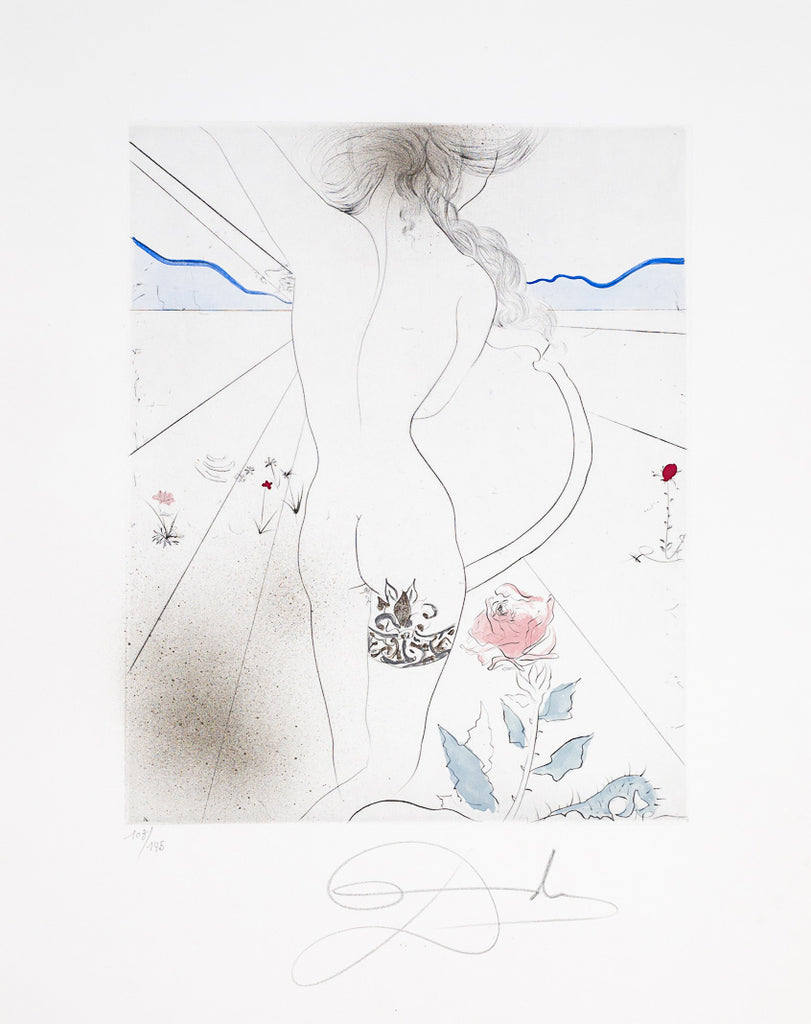 "Nude with Garter" is an etching with coloring created by Salvador Dalí as a part of his series "The Hippies" in 1969. From the edition of 245, the artwork is signed 'Dalí' lower right and annotated lower left. The image size is 15.5 x 12.5" and the artwork is framed in a custom, closed-corner, gold leaf frame. The artwork ships framed and is accompanied by a certificate of authenticity.