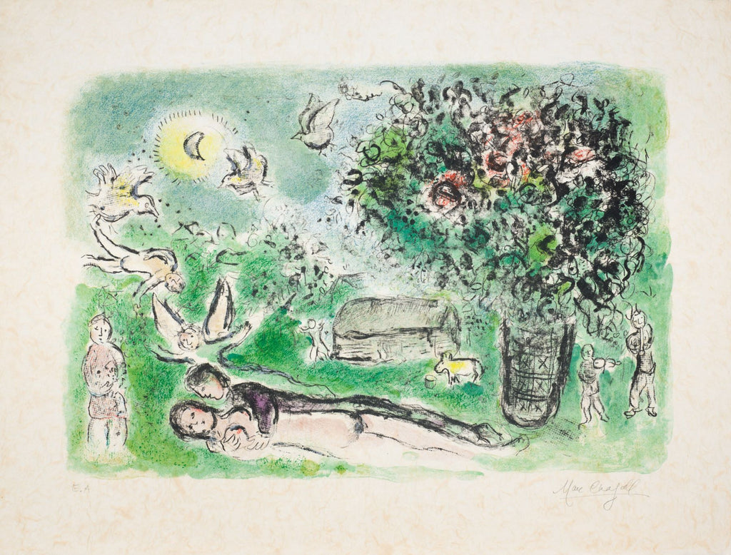 "Pastoral (M.906)" is a lithograph on Japon created by Marc Chagall in 1977. From the edition of 61, the artwork is signed 'Marc Chagall' lower right and annotated lower left. The image size is 15.75 x 23" and the artwork is framed in a custom, closed-corner, gold leaf frame. The artwork ships framed and accompanied by a certificate of authenticity.
