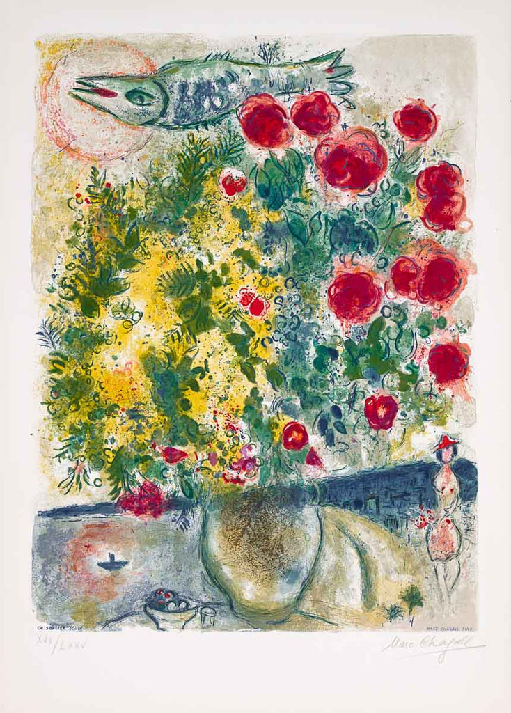 In these lithographs, one rediscovers the characters dear to Chagall: the lovers in the firmament, the men whom Malaparte saw walking on “the roof of the storm, on the guttering of clouds,” the woman with flowers, and the Sirene, the most poignant symbol of Nice. There are also visions and memories from his childhood in Vitebsk, which he called the “invisible, supposedly illogical form of the object,” and which we come to perceive as he did. Above all, the midday sun and the brilliancy of his flowers stand out. They explain the richness of tones in these lithographs - the beauty and harmony of the colors - the deep blue, the somber vividness of the reds, the haunting garland of flowers.