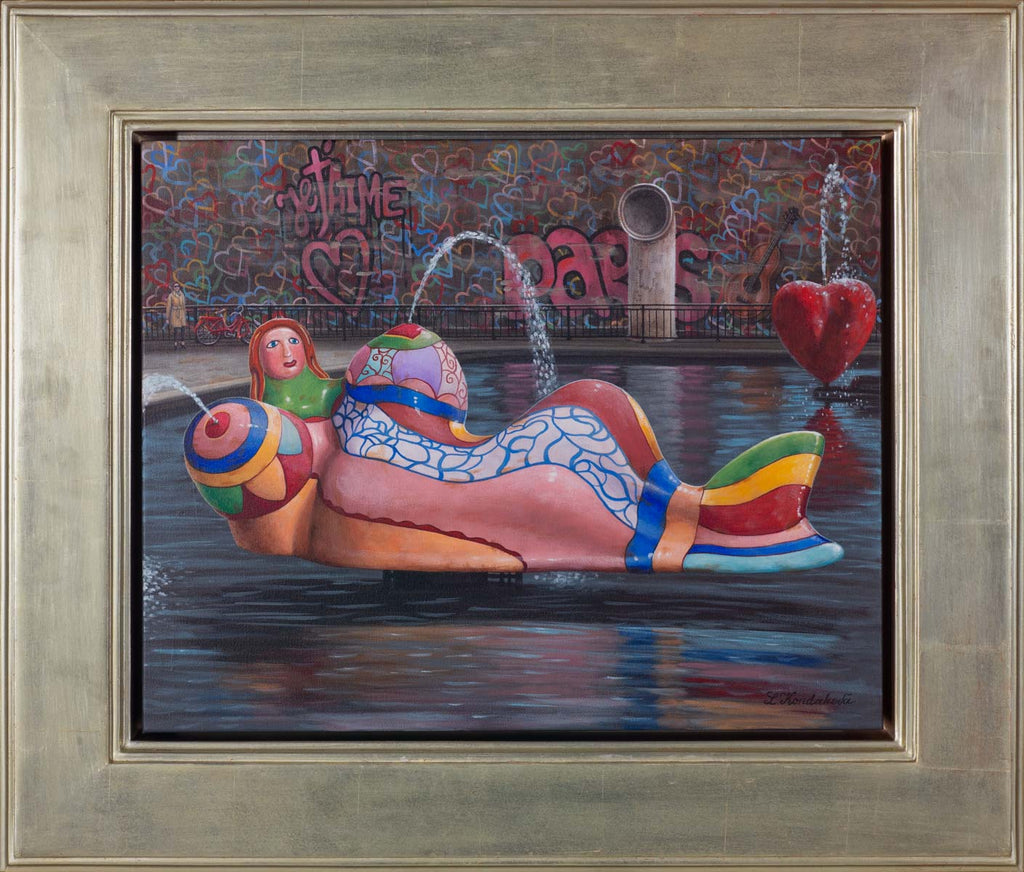"Stravinsky Fountain, Mermaid" is an acrylic on canvas painting created by Liudmila Kondakova in 2023. The artwork is signed 'L. Kondakova' lower right. The canvas size is 16 x 20" and the artwork is framed in a custom, closed-corner, gold leaf frame. The artwork ships framed.