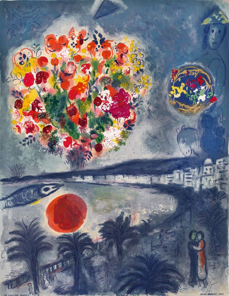 "Sunset (Nice et la Côte d'Azur, CS.26)" is an hand-signed lithograph created by Marc Chagall. The image size is 24" x 18". Framed size is 38" x 31" The artwork ships framed, signed and with a certificate of authenticity.