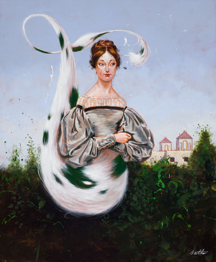 Philippe Bertho is classically trained having enrolled in art school in Reims, France in the early 1990s. There, he spent considerable time studying decorative trompe l’oeil painting. Tromp l’oeil (“to fool the eye”) is a technique used by artists to create the illusion of a 3rd dimension on a flat surface. It is obvious from Bertho’s artwork that he fools much more than the eye…he draws one in by the heart and also quite frequently by the funny bone. Despite his ability to perfectly render reproductions of masterworks, Bertho was drawn to the world of fantasy and illusion. As his style developed, he drew inspiration from renowned contemporary trompe-l’oeil artist, Jacques Poirier. In his early work, Bertho exhibited ingenuity by including unusual materials in his paintings. Employing objects that other’s found useless – corrugated iron, rusted metal boxes, old light bulbs – he was fascinated with his ability to bring his art alive by creating dimension – either by the addition of these items directly onto his canvas or later through the technique of trompe l’oeil.