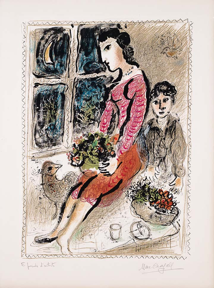 "The Purple Bodice (M.691)" is a lithograph created by Marc Chagall in 1973. From the edition of 54, the artwork is signed 'Marc Chagall' lower right and annotated lower left. The image size is 26.5 x 17.5" and the artwork is framed in a custom, closed-corner, gold leaf frame. The artwork ships framed and accompanied by a certificate of authenticity.