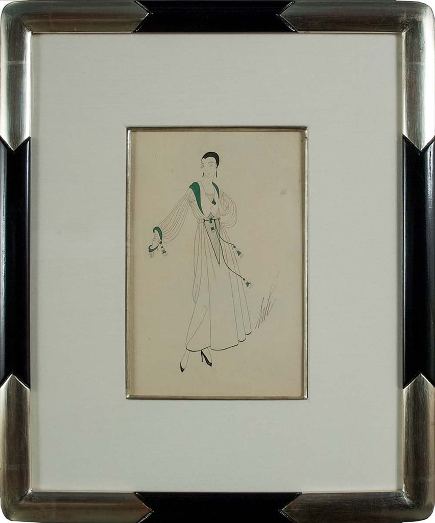 "Dress Design for Henri Bendel" is a gouache on paper painting created by Erté in 1915. The artwork is signed 'Erté' center right. The Erté and "Composition originale" stamps are also included verso. The image size is 6.25 x 3.5" and the artwork is framed in a custom, closed-corner, Art Deco frame. The artwork ships framed.