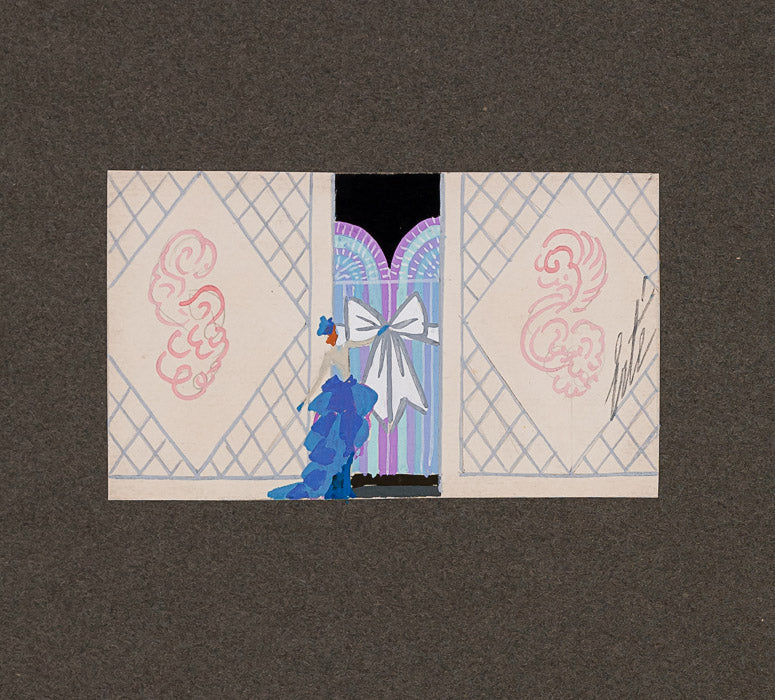 "Les Rubans (Ouverture du Rideau, N5473)" is a gouache and pencil on board painting by Erté. The artwork is signed 'Erté' center right. The image size is 2.25 x 4" and the artwork is framed in a classic, gold-tone frame. The artwork ships framed.