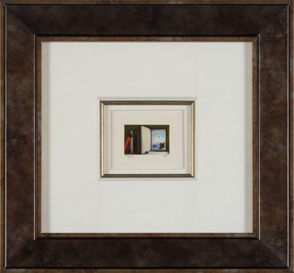 "Open Book" is a lithograph created by Fanny Brennan in 2000. From the edition of 300, the artwork is initialed 'FMB' lower right and annotated lower left. The image size is 1.5 x 2.25" and the artwork is framed in a contemporary silver and dark gray frame. The artwork ships framed and accompanied by a certificate of authenticity.