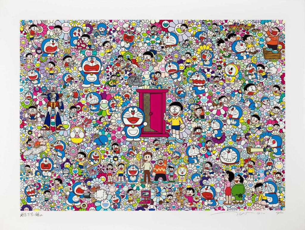 "Anywhere Door (Dokodemo Door): Life From Here On" is a silkscreen with gold leaf and platinum leaf created by Takashi Murakami in 2022. From the edition of 100, the artwork is signed, dated and annotated lower right by Murakami, printed signature 'Fujiko F. Fujio' lower left. The sheet size is 22.12 x 29.25" and the artwork is framed in a contemporary white frame. The artwork ships framed and is accompanied by a certificate of authenticity.