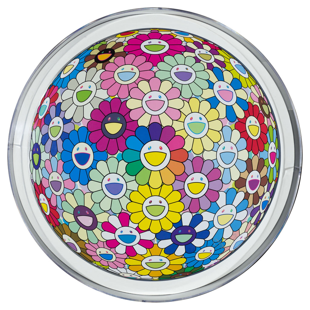 "Burying My Face in the Field of Flowers" is a hand-signed offset lithograph created by Takashi Murakami in 2022. The image size is 28" diameter. The artwork ships framed, signed and with a certificate of authenticity.