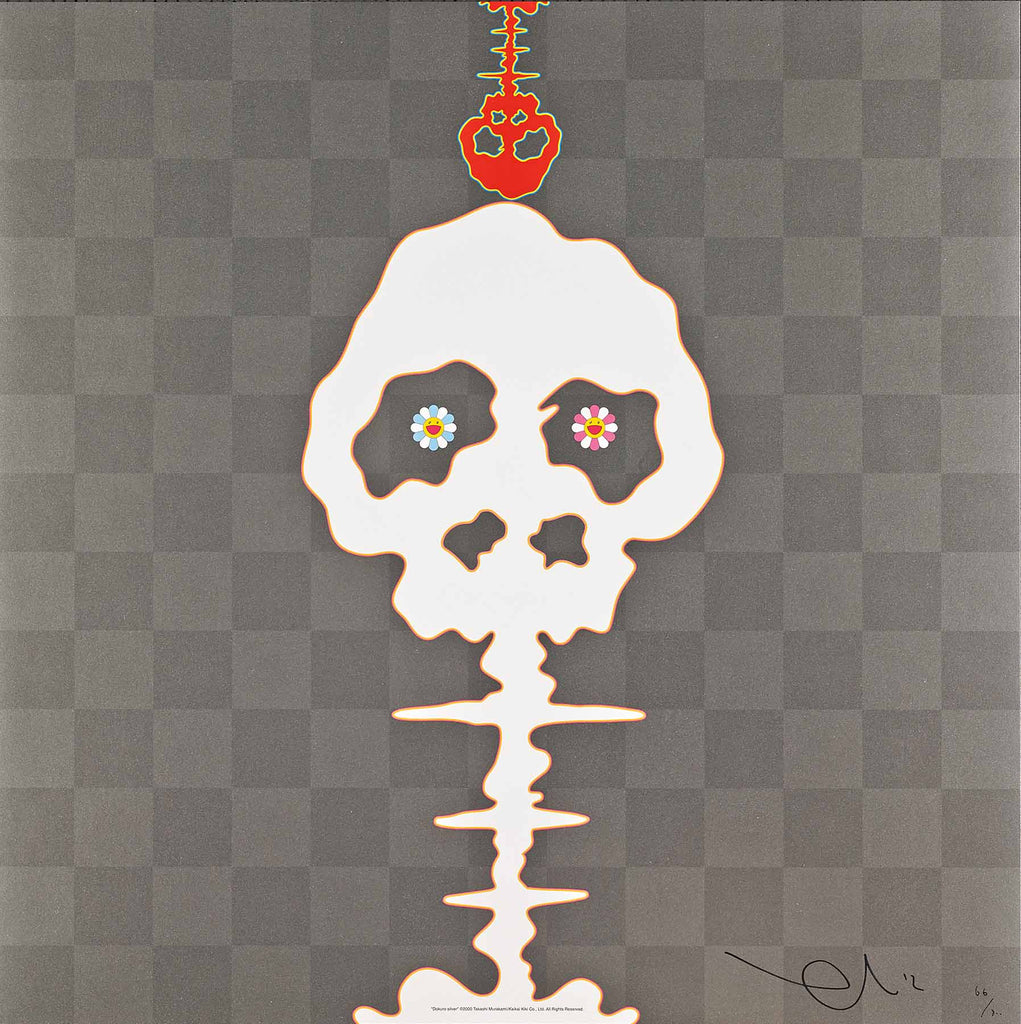 "Dokuro Silver" is an offset lithograph with cold stamp created by Takashi Murakami in 2012. From the edition of 300, the artwork is signed, dated and annotated lower right. The image size is 19.62 x 19.62". The artwork ships framed and accompanied by a certificate of authenticity.