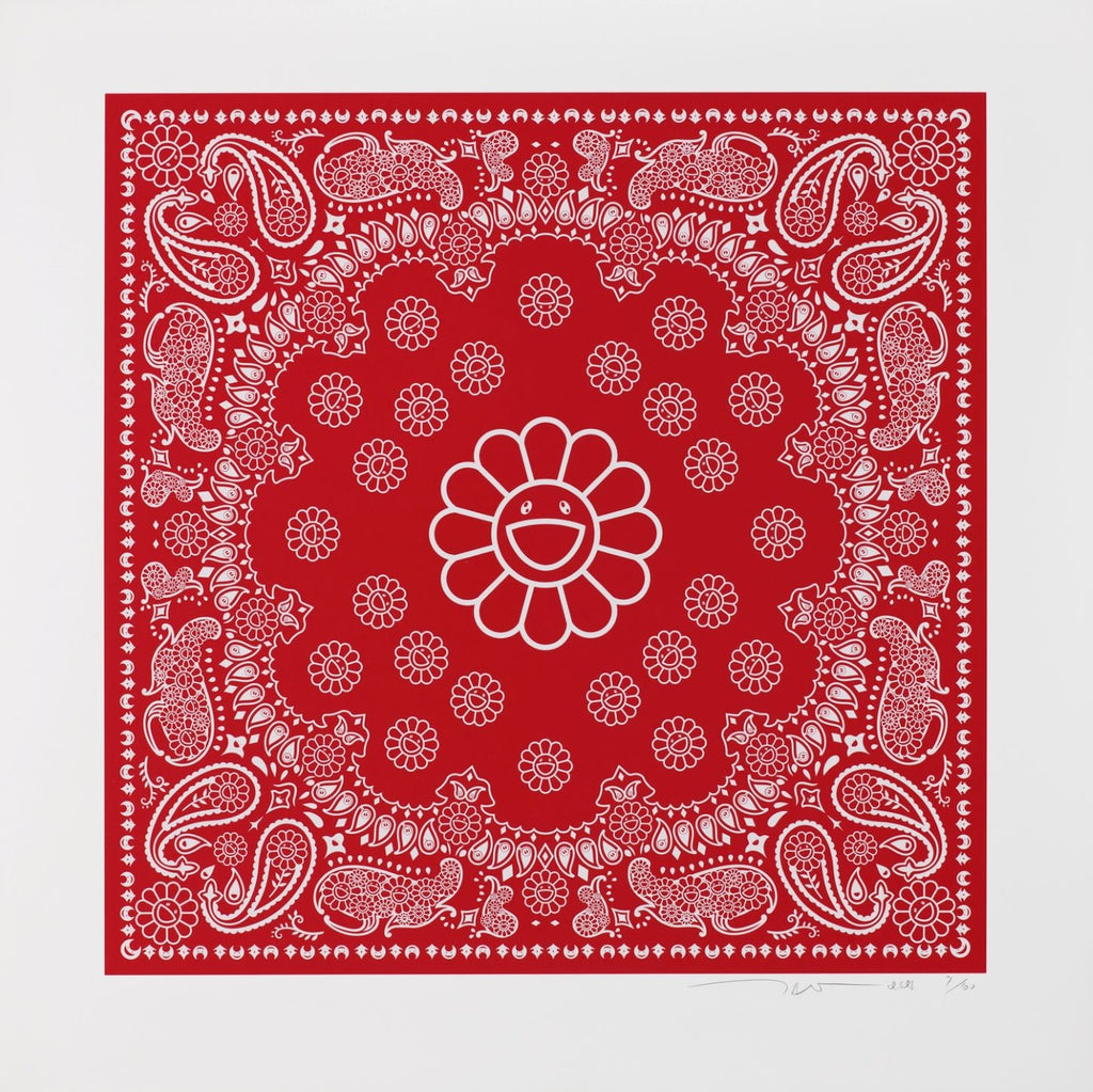 "Flower Paisley" is a silkscreen created by Takashi Murakami in 2021. From the edition of 100, the artwork is signed, dated and annotated lower right. The image size is 17.37 x 17.37" and the artwork is framed in a contemporary white frame. The artwork ships framed and accompanied by a certificate of authenticity.