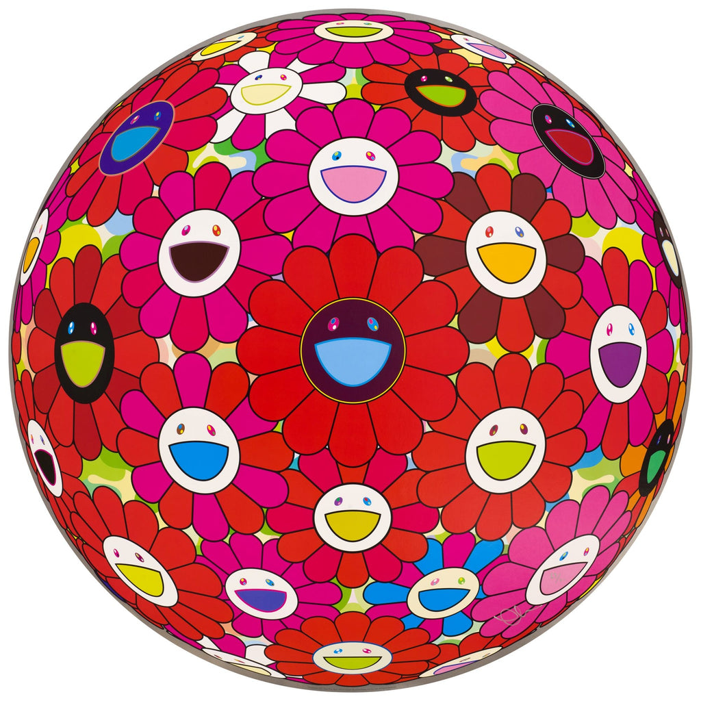 "Flowerball (3D) - Red, Pink, Blue" is a 4c offset lithograph with cold stamp created by Takashi Murakami in 2013. From the edition of 300, the artwork is signed, dated and annotated lower right. The image size is 28" in diameter and the artwork is framed in a contemporary plexi-box frame. The artwork ships framed and accompanied by a certificate of authenticity.