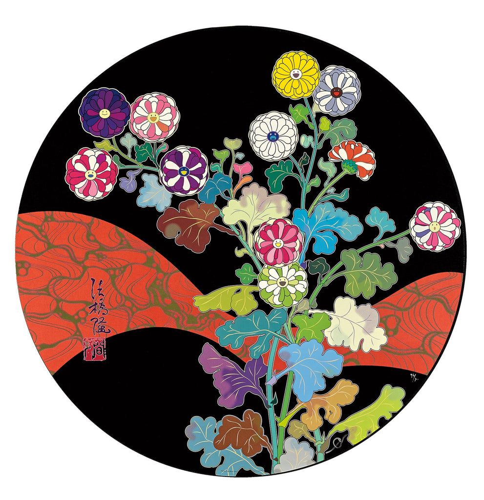 "Kansei: Fresh Bloos" is an offset lithograph created by Takashi Murakami in 2014. From the edition of 300, the artwork is signed and annotated lower right. The image size is 28" in diameter and the artwork is framed in a contemporary plexi-box frame. The artwork ships framed and accompanied by a certificate of authenticity.