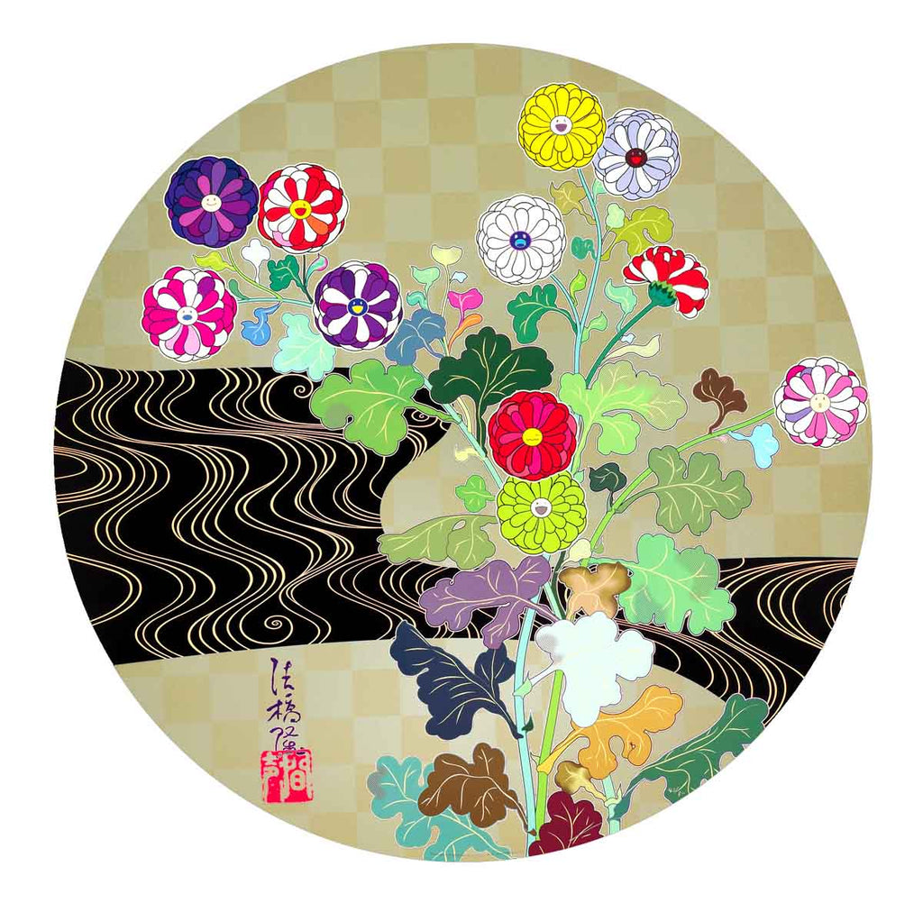 "Kansei Korin Gold" is an offset print with cold stamping and high gloss varnish created by Takashi Murakami in 2009. From the edition of 300, the artwork is signed and annotated lower right. The image size is 28" in diameter and the artwork is framed in a contemporary plexi-box frame. The artwork ships framed and accompanied by a certificate of authenticity.