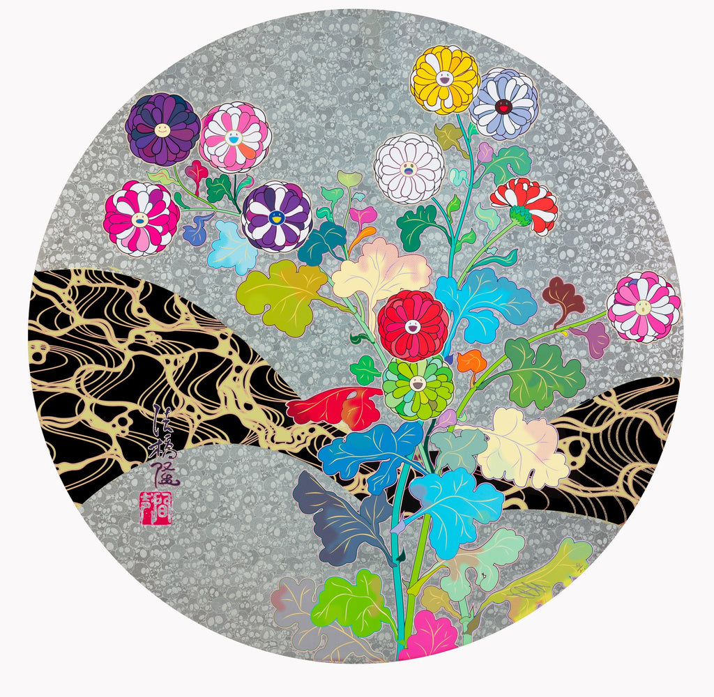 "Korin: The Land Beyond Death, Bathed in Light, 2022" is a offset lithograph with cold stamp and high gloss varnish created by Takashi Murakami in 2022. The image size is 28" diameter. The artwork ships framed and with a certificate of authenticity.