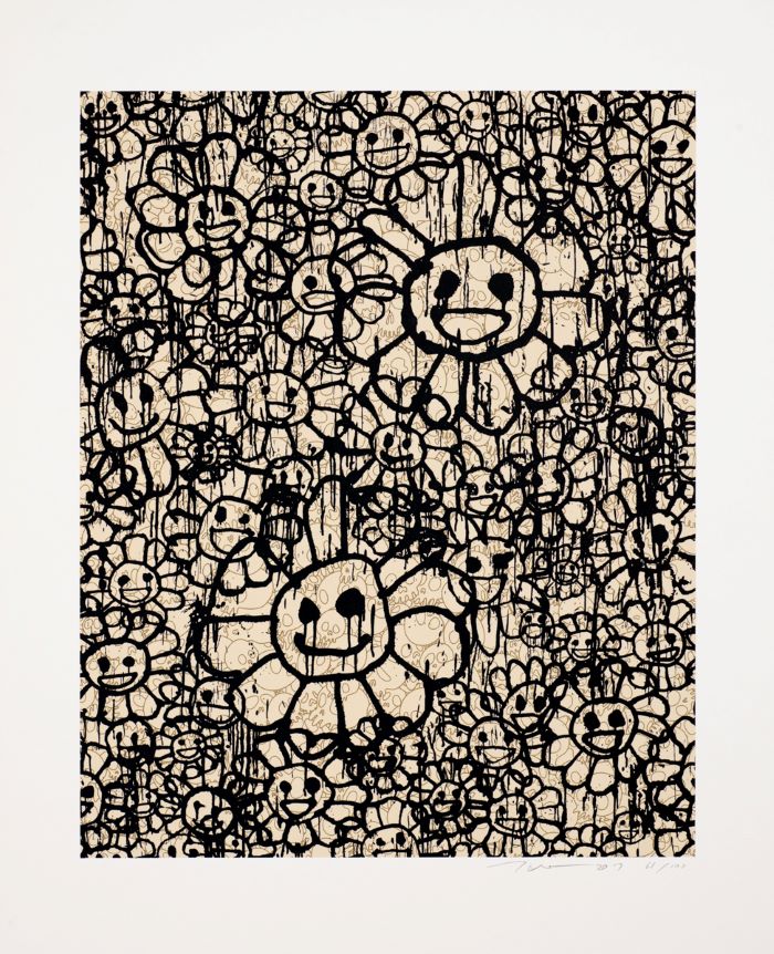 "Madaski Flowers Beige A" is a silkscreen created by Takashi Murakami in 2017 for his 'Madsaki Flowers' series. From the edition of 100, the artwork is signed, dated and annotated lower right. The image size is 14.75 x 11.75". The artwork ships framed and accompanied by a certificate of authenticity.