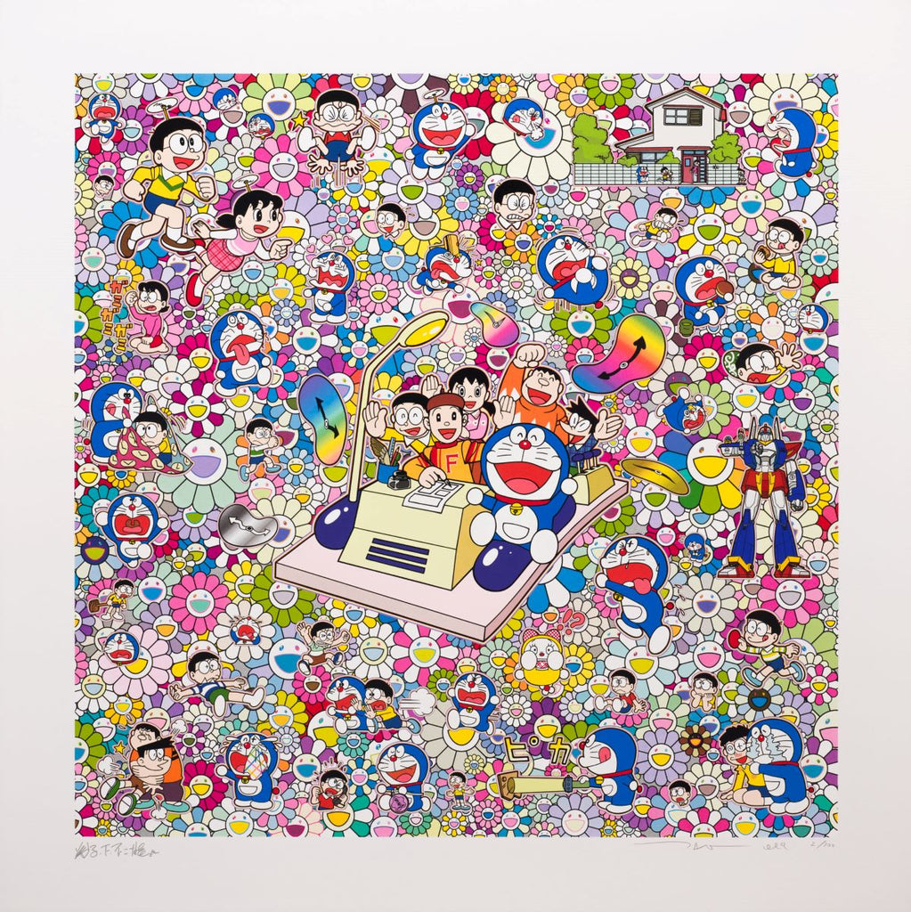 "On an Endless Journey on a Time Machine with Author Fujiko F. Fujio" is a silkscreen created by Takashi Murakami in 2019. From the edition of 300, the artwork is signed, dated and annotated lower right, printed signature by Fujiko F. Fujio lower left. The image size is 19.75 x 19.75". This artwork ships framed and accompanied by a certificate of authenticity.