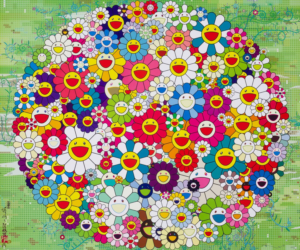 Takashi Murakami was born in Tokyo, Japan on February 1, 1962. His influence for art derives from his mother, who studied needlepoint and designed textiles. Murakami knew he wanted to be an artist when he grew up, and had always taken a large interest in animation and comics. He studied art throughout much of his adolescence, and applied to study at Tokyo National University. He was accepted and later received his Ph.D. in Fine Arts and Music, in which he learned “Nihong”, or traditional Japanese painting. After his studies, Murakami moved to New York in 1994 and was exposed to, and inspired by, Western contemporary artists like Jeff Koons.