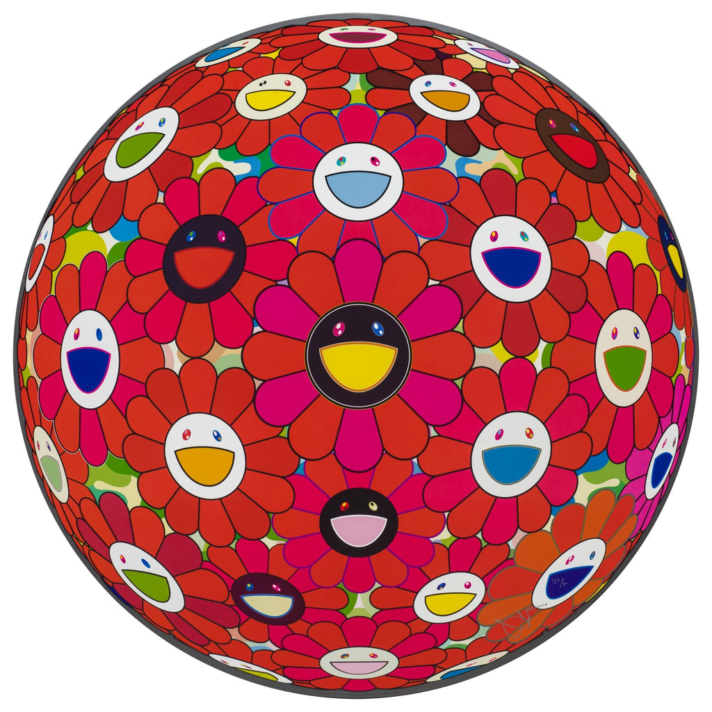 "Red Flower Ball (3-D)" is a 4c offset lithograph with cold stamp created by Takashi Murakami in 2013. From the edition of 300, the artwork is signed and annotated lower right. The image size is 28" in diameter and the artwork is framed in a contemporary plexi-box frame. The artwork ships framed and accompanied by a certificate of authenticity.