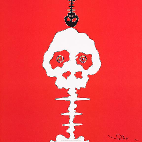 "Red - Time" is an offset lithograph created by Takashi Murakmi in 2011. From the edition of 300 the artwork is signed, dated and annotated lower right. The image size is 19.62 x 19.62" and the artwork is framed in a contemporary black frame. The artwork ships framed and accompanied by a certificate of authenticity.