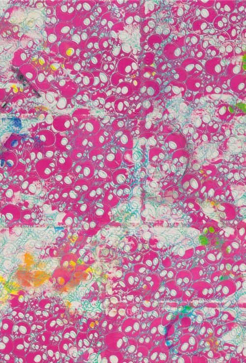 Created in 2016, this painting is part of Murakami’s mature body of post-Superflat work, where his visual language has become more introspective and materially ambitious. Untitled (2016) is a vibrant and conceptually layered composition executed on sewn canvas panels, which resemble textile quilting — a format Murakami has explored to emphasize modularity, handcraft, and surface tension. The entire canvas is painted over with a repeating pattern of Murakami’s iconic skull motif—hot pink on a white ground, such that the skulls’ eyes and noses appear white, staring out in hollow repetition. The background is further energized with daubs of color — bright aqua, yellow, and orange — infusing the image with rhythm, spontaneity, and chromatic contrast. The use of stitched panels adds a tactile, sculptural element to the surface, evoking Japanese textile traditions, Buddhist robes, and patchwork as an aesthetic and philosophical gesture. It also suggests an awareness of material fragility and layered construction — both literal and symbolic.