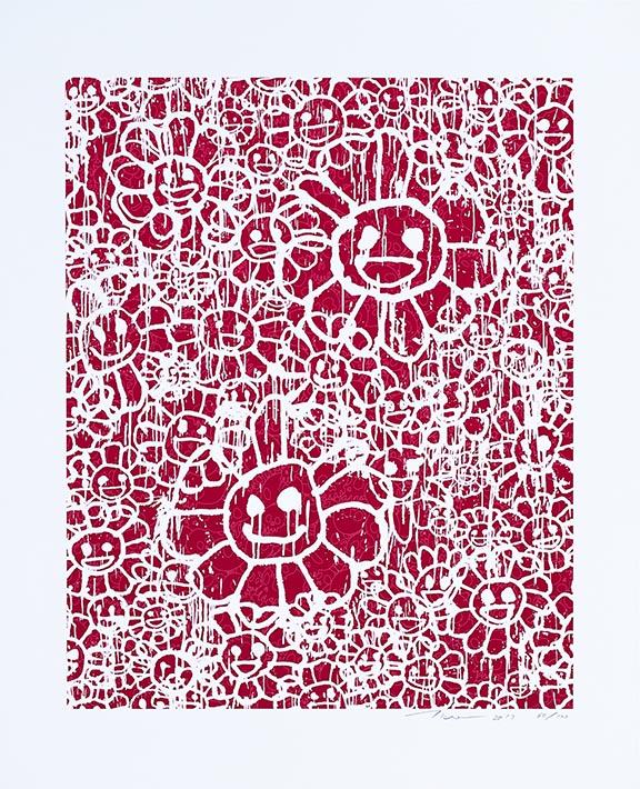 "Madaski Flowers Red A" is a silkscreen created by Takashi Murakami in 2017 for his 'Madsaki Flowers' series. From the edition of 100, the artwork is signed, dated and annotated lower right. The image size is 14.75 x 11.75". The artwork ships framed and accompanied by a certificate of authenticity.