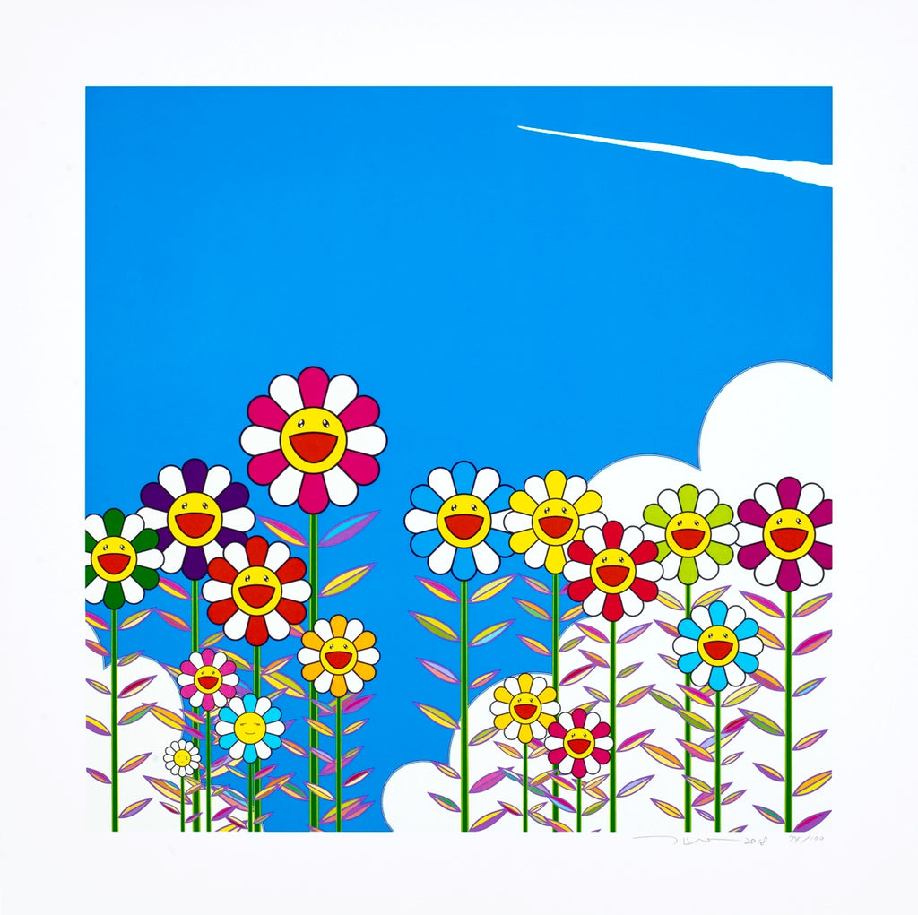 "Vapor Trail in the Blue Summer Sky" is a lithograph created by Takashi Murakami in 2018. From the edition of 100, the artwork is signed, dated and annotated lower right. The image size is 13.5 x 13.5" and the artwork is framed in a contemporary white frame. The artwork ships framed and is accompanied by a certificate of authenticity.