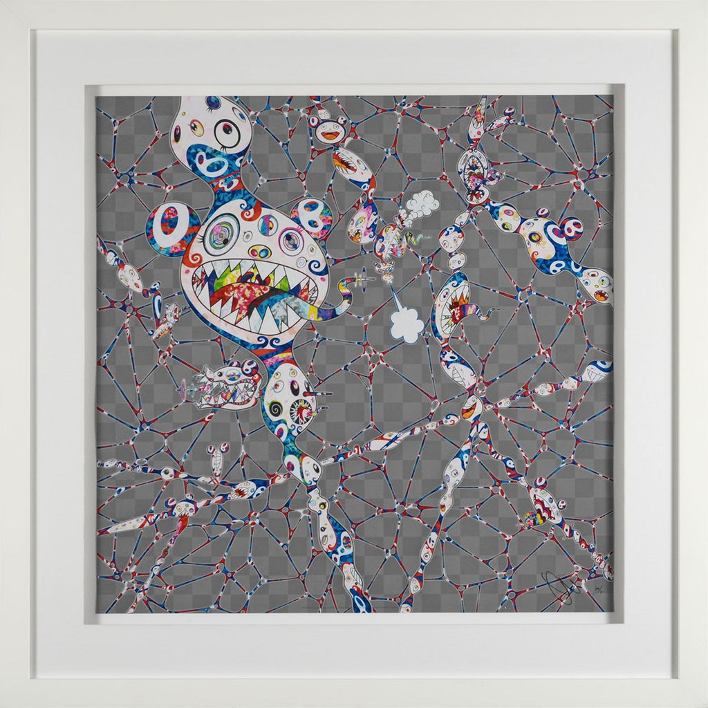 "We Are Destined to Meet Someday! But for Now, We Wander in Different Dimensions" is an offset lithograph created by Takashi Murakami in 2016. From the edition of 300, the artwork is signed and annotated lower right. The image size is 26.75 x 26.75" and the artwork is framed in a contemporary white frame. The artwork ships framed and accompanied by a certificate of authenticity.