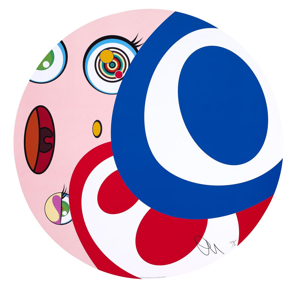 "We Are the Jocular Clan 10" is an offset lithograph created by Takashi Murakami for his 2018 series "We Are the Jocular Clan". From the edition of 300, the artwork is signed and annotated lower right. The image size is 19.5" in diameter and the artwork is framed in a contemporary plexi-box frame. The artwork ships framed and accompanied by a certificate of authenticity.