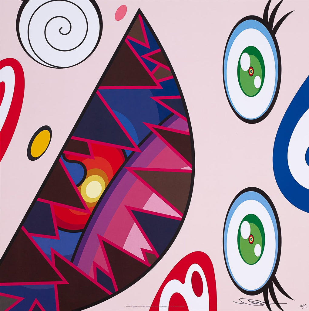 "We Are the Square Jocular Clan #7" is an offset lithograph created by Takashi Murakami for his 2018 series "We Are the Square Jocular Clan". From the edition of 300, the artwork is signed and annotated lower right. The image size is 18.75 x 18.75" and the artwork is framed in a contemporary white frame. The artwork ships framed and accompanied by a certificate of authenticity.