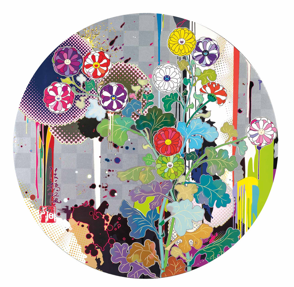 "With Reverence, I Lay Myself Before You - Korin - Chrysanthemum" is an offset lithograph with cold stamp and high gloss varnish, created by Takashi Murakami in 2010. From the edition of 300, the artwork is signed and annotated lower right. The image size is 28" diameter and the artwork is framed in a custom contemporary plexi-box frame. The artwork ships framed and accompanied by a certificate of authenticity.