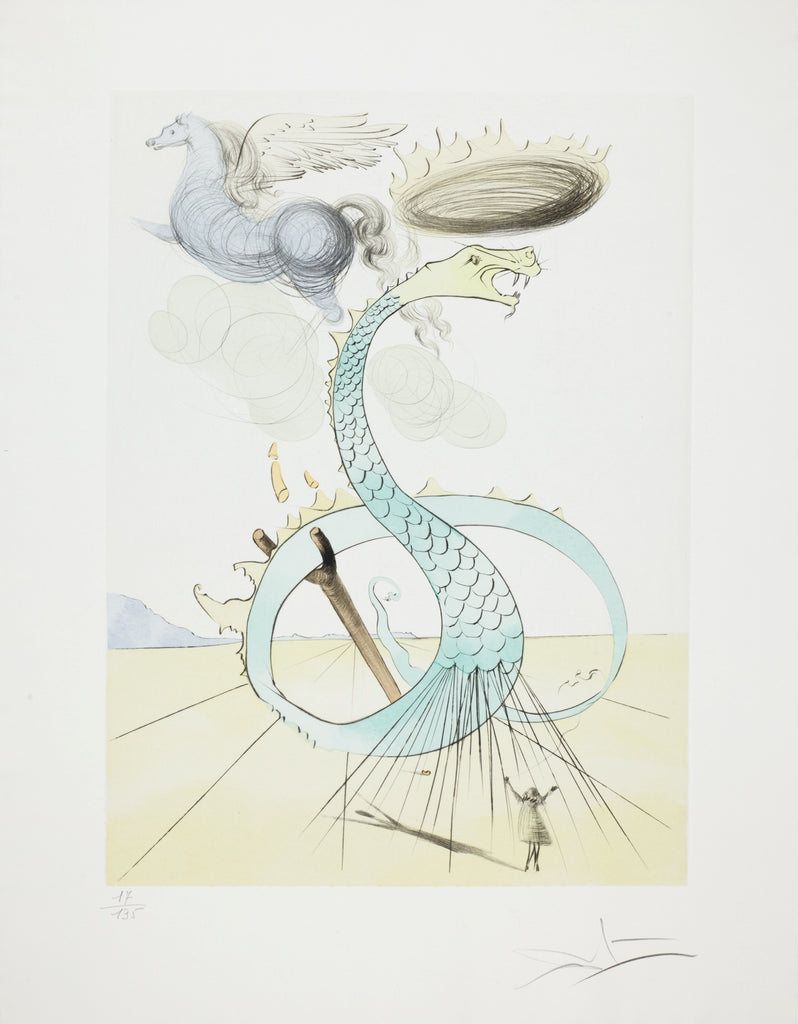 "Dan" is an etching with color stencil on BFK Rives, created by Salvador Dalí as a part of his series "Twelve Tribes of Israel" in 1973. From the edition of 530, the artwork is signed 'Dalí' lower right and annotated lower left. The image size is 19.62 x 14.37" and the artwork is framed in a ornate, gold tone frame. The artwork ships framed and is accompanied by a certificate of authenticity.