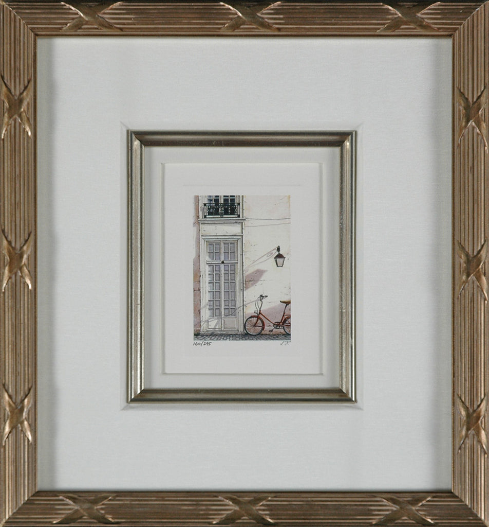 "Le Bicylette" is a lithograph on paper created by Liudmila Kondakova in 2006. From the edition of 325, the artwork is initialed 'L.K' lower right and annotated lower left. The image size is 3.75 x 2.25" and the artwork is framed in a classic 'reed and ribbon' gold-tone frame. The artwork ships framed and accompanied by a certificate of authenticity.