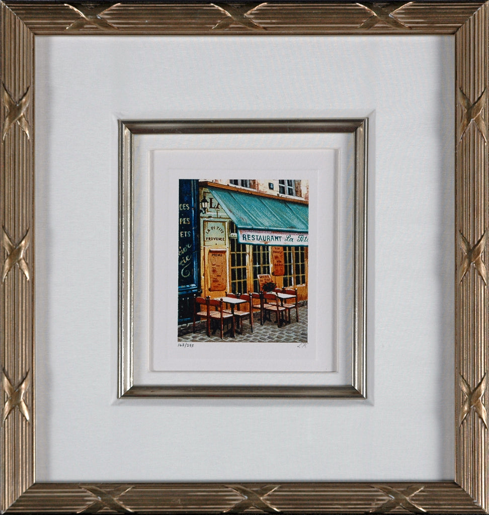 "La Petite Provence" is a lithograph on paper created by Liudmila Kondakova in 2006. From the edition of 325, the artwork is initialed 'L.K' lower right and annotated lower left. The image size is 4.25 x 3.25" and the artwork is framed in a classic 'reed and ribbon' gold-tone frame. The artwork ships framed and accompanied by a certificate of authenticity.
