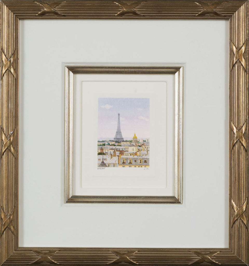 "Paris Daybreak" is a lithograph on paper created by Liudmila Kondakova in 2006. From the edition of 325, the artwork is initialed 'L.K' lower right and annotated lower left. The image size is 3 x 2" and the artwork is framed in a classic 'reed and ribbon' gold-tone frame. The artwork ships framed and accompanied by a certificate of authenticity.