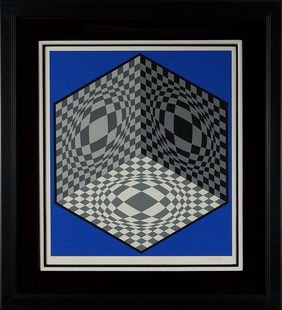 Victor Vasarely was a French-Hungarian artist credited as the father of the Op Art movement. Utilizing geometric shapes and colorful graphics, the artist created compelling illusions of spatial depth. Cubic Relationship is a hand-signed lithograph from a complete edition of 325.