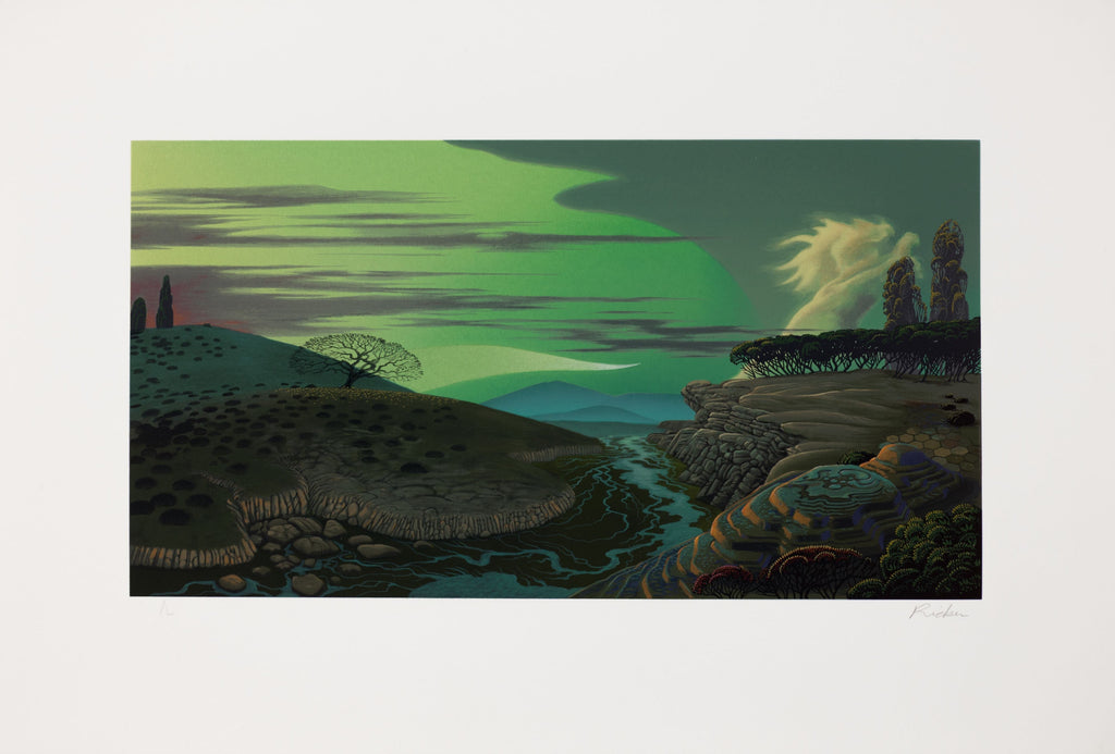 Ricker created four stunning images for a suite titled ‘Sacred Places’ – all powerful images of earthly splendor. The vistas he paints, almost desolate in a primeval way, are a chorus of voices that sing of the glory of nature. In a style which he calls ‘Epic Visionary,’ he presents a view that is at once new and fresh and yet as deep-rooted and enduring as the pristine landscapes themselves.