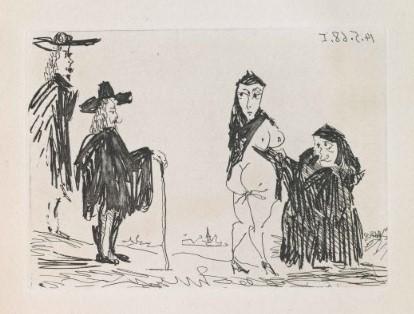 "Célestine Takes Action: Soliciting (B.1563)" is an etching created by Pablo Picasso in 1968 for his series 'La Célestine'. From the edition of 400, the image size is 4 x 5". The artwork ships framed and accompanied by a certificate of authenticity.