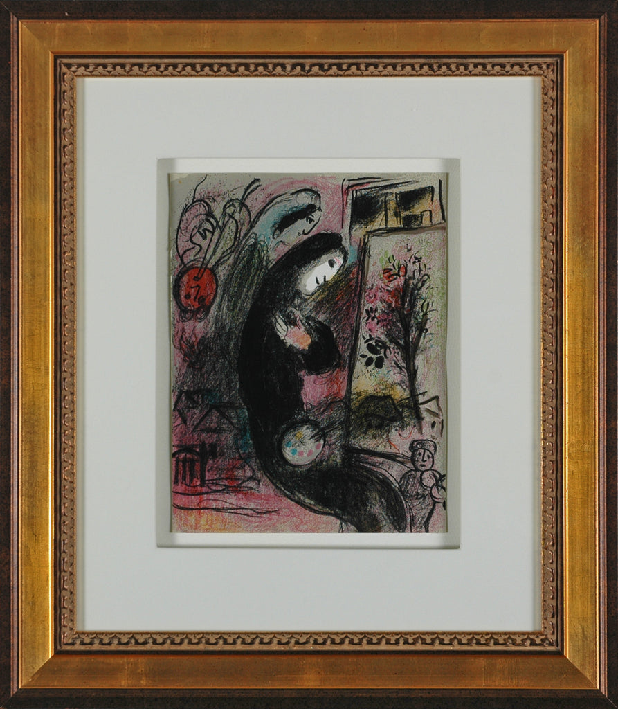 "Inspiration (M.398)" is a lithograph created by Marc Chagall which was bound into Volume II of the Mourlot catalog raisonné of lithographs, printed in 1963. The total number of unsigned prints is unknown. The image size is 12.5 x 9.5" and the artwork ships framed and accompanied by a certificate of authenticity.