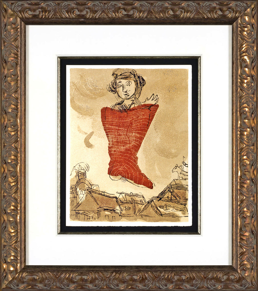 "Comme un Barbare (#2)" from Marc Chagall's 'Poèmes', 1968. This artwork is a color woodcut on Rives wove paper from the edition of 238. The image size is 13 x 10". The artwork ships framed and accompanied by a certificate of authenticity.