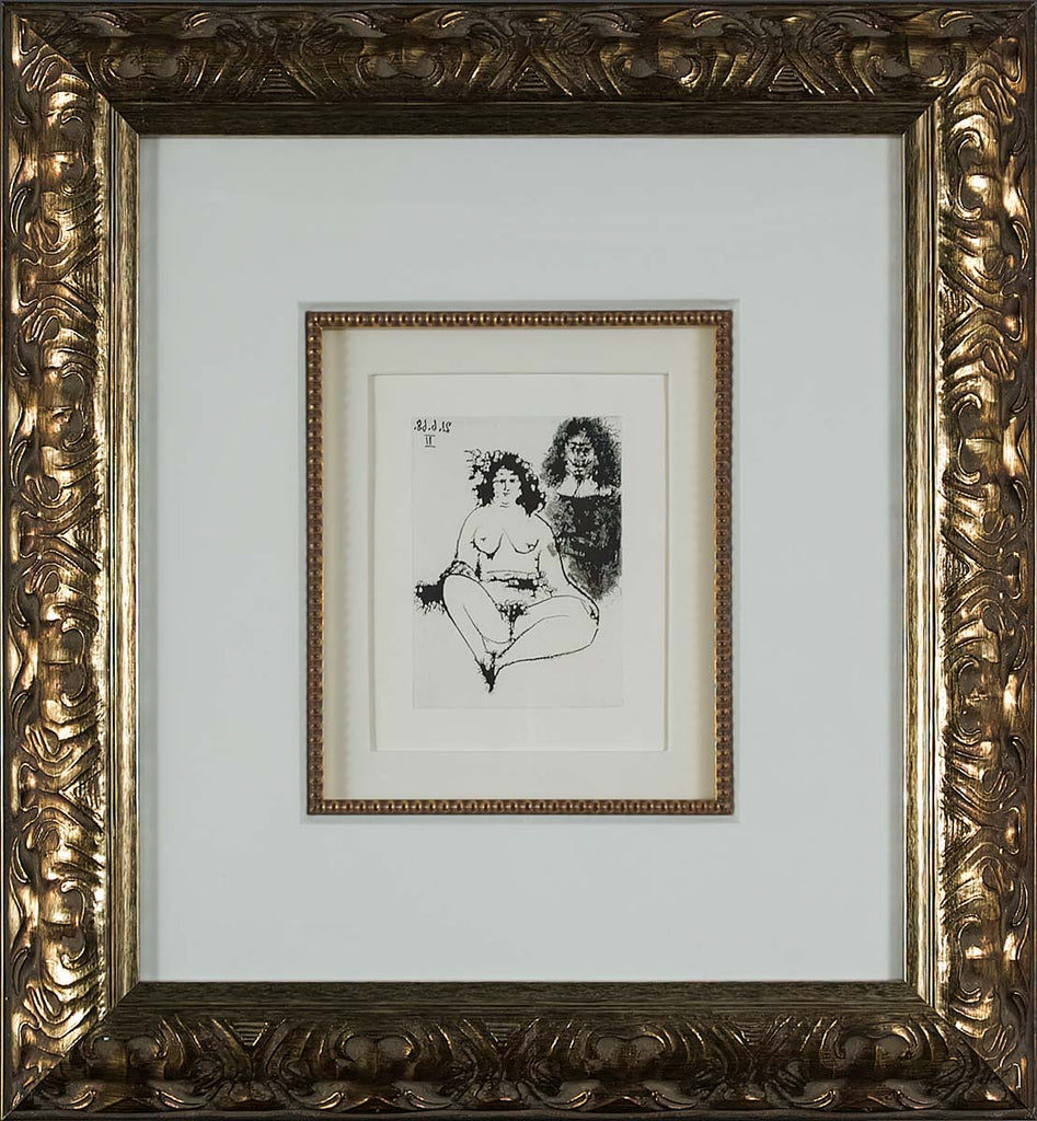 "Corpulent Courtesan and 'Musketeer (B.1655)" is an aquatint created by Pablo Picasso in 1968 for his series 'La Célestine'. From the edition of 400, the image size is 5 x 4" and the artwork is framed in an ornate, gold-tone frame. The artwork ships framed and accompanied by a certificate of authenticity.