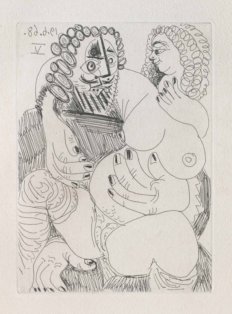 "Corpulent Courtesan on the Lap of a Bearded Man (B.1648)" is an etching created by Pablo Picasso in 1968 for his series 'La Célestine'. From the edition of 400, the image size is 5 x 3.5". The artwork ships framed and accompanied by a certificate of authenticity.