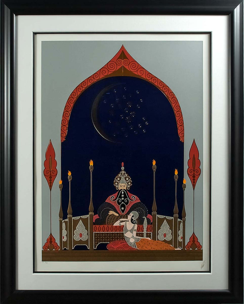 "Casbah" is a serigraph created by Erté in 1989. This image was created originally as a stage set for the "Folies Bergere" production of "Aladdin" in 1929. From the edition of 650, the artwork is estate stamped with the artists signature lower right. The image size is 35 x 25.5" and the artwork is framed in a contemporary, black frame. The artwork ships framed and accompanied by a certificate of authenticity.