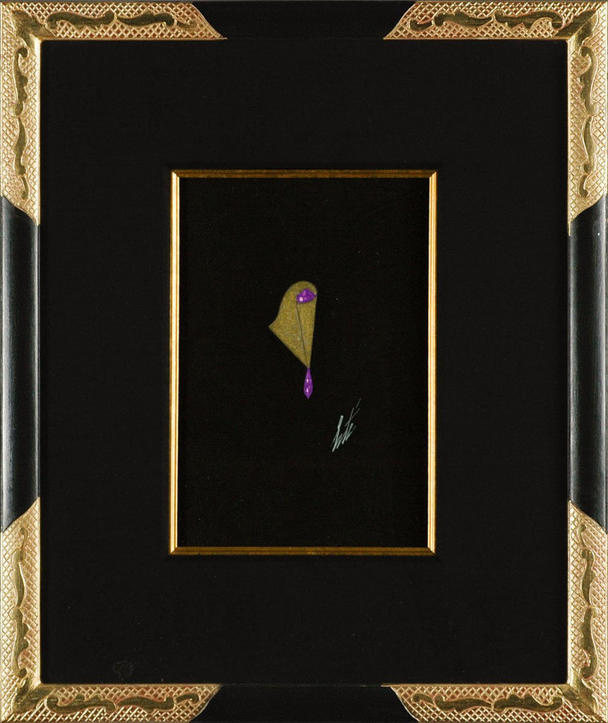 "Clip or Broach (No.18.834)" is a gouache painting on paper created by Erté as a potential jewelry design. The artwork is signed 'Erté' lower right and numbered and titled in Erté's hand verso - "No 18.834" and "Clip ou broche." The Erté and "Composition originale" stamps are also included verso. The image size is 3 x 1.25" and the artwork is framed in a custom, closed-corner, Art Deco frame. The artwork ships framed.