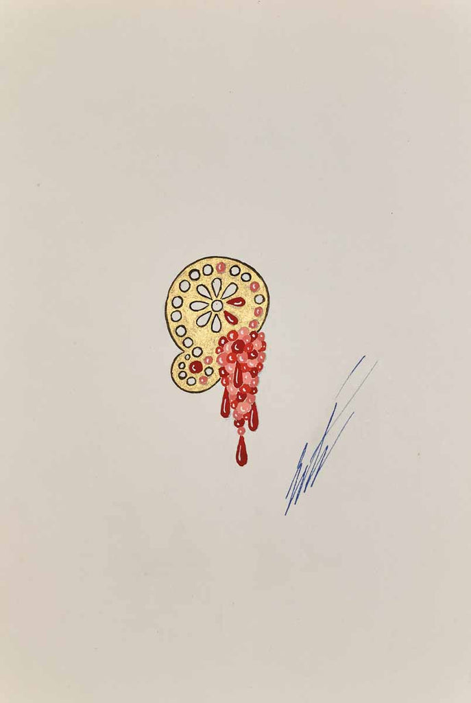 This beautiful painting in gouache and gold paint was created as a brooch design in the 1980s. "Clip or Broach (No.18.843) is signed 'Erté' on the front, and numbered and titled in Erté's hand verso - "No 18.843" and "Clip ou broche." The Erté and "Composition originale" stamps are also included verso. The image size is 3.25 x 1.75" and the artwork is framed in a classic, gold-tone frame. The artwork ships framed.