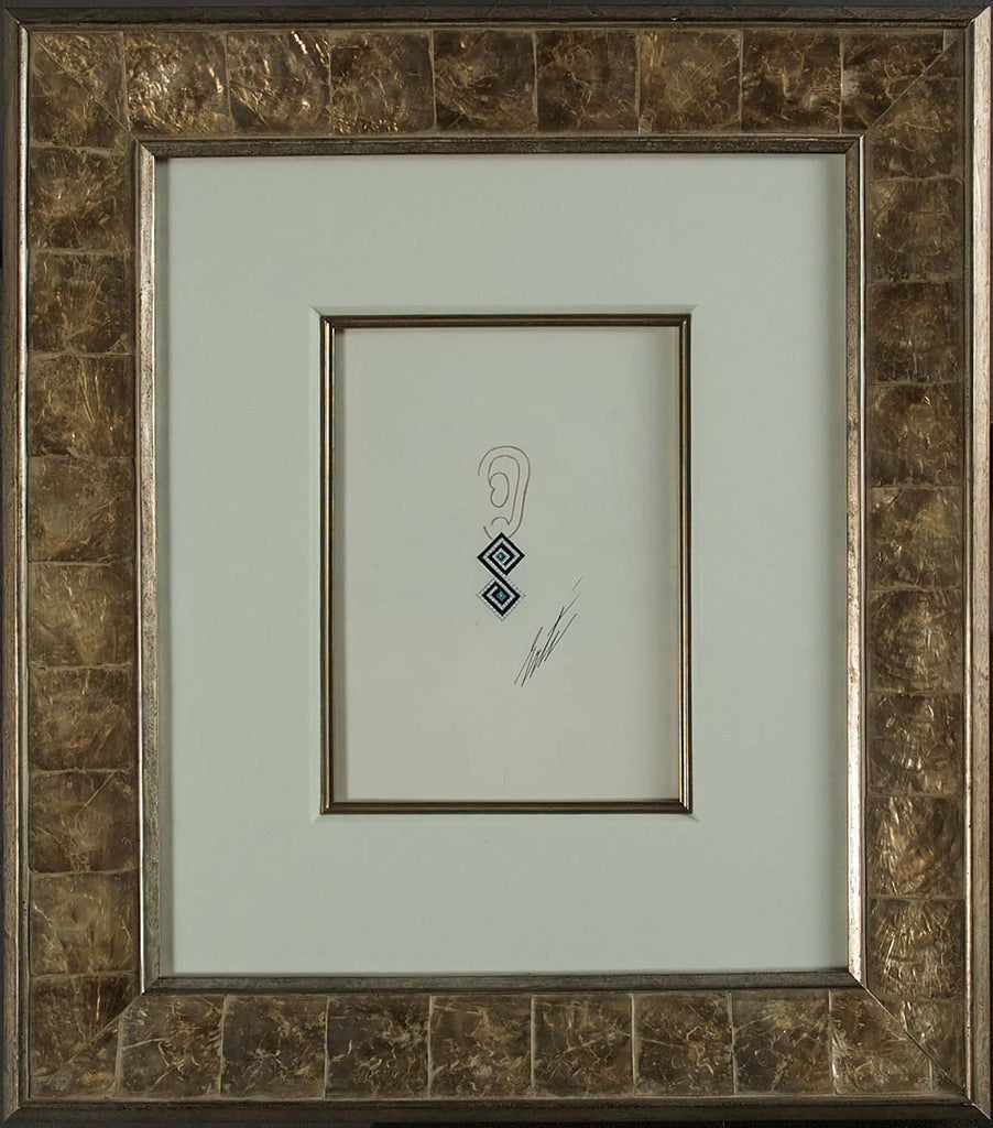 This beautiful painting in gouache was created as a ring design circa 1980s. "Geometry (Earrings)" is signed 'Erté' center right, and numbered and titled in Erté's hand verso - "No 18.885", "Geometry", "Earrings in black onyx with diamonds and emeralds or chryzoprases." The Erté and "Composition originale" stamps are also included verso. The image size is 3 x 1" and the artwork is framed in a classic, gold-tone frame. The artwork ships framed.