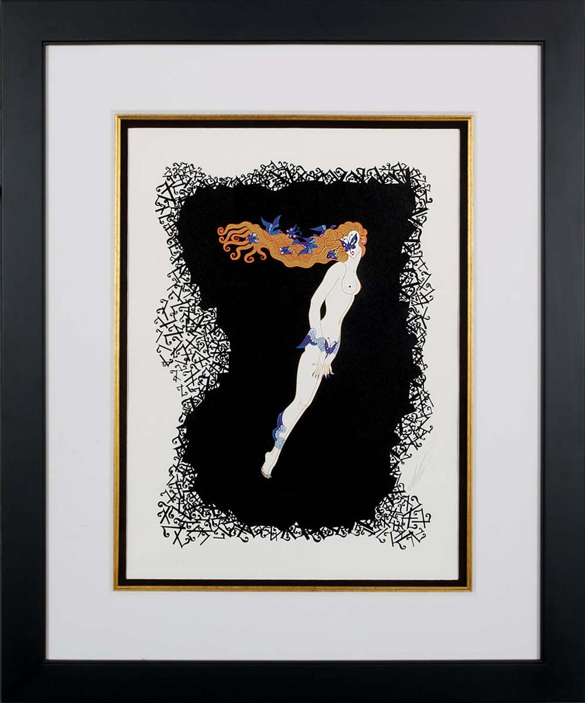 "Numeral 7" is an embossed serigraph created by Erté in 1980 for his 'Numerals' suite. From the edition of 499, the artwork is signed 'Erté' lower right. The image size is 16.75 x 12.25" and the artwork is framed in a contemporary black frame. The artwork ships framed and accompanied by a certificate of authenticity.
